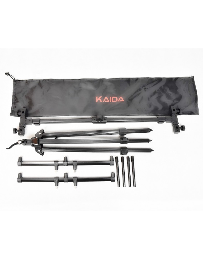 Род-под Kaida A28-5 усиленной конструкции из алюминиевого сплава на 3 удилища. Крепкая и надежная конструкция с телескопической регулировкой. Усиленная крепёжная фурнитура всех соединений обеспечивает высокую стабильность и прочность конструкции. Конструкцией предусмотрены регулировки по наклону и высоте. Раздельно регулируемые съемные ноги позволяют установить род-под в самых различных вариантах и на неровных поверхностях. Род под опирается на треногу, с качественным шарниром, который позволяет подставке вращаться на 360 градусов.
