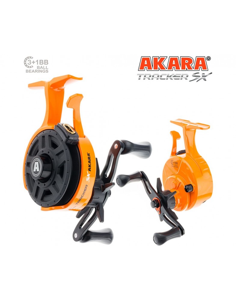 Катушка мультипликаторная зимняя Akara Tracker SX 3+1 bb с курком. Мультипликаторная катушка для оснащения зимних удочек для отвесной ловли. Катушка позволяют вываживать рыбу с глубины, используя только катушку, как при ловле на спиннинг – тащить рыбу руками за леску не обязательно. Шпули открытые, позволяют зрительно контролировать намотку лески на шпулю. Катушки не снабжены лесоукладывателем. Отличительной особенностью катушек является удлинённая ножка, которая даёт достаточную свободу для пальцев при удержании удочки в процессе вываживания. Облегченная алюминиевая шпуля. Облегченный корпус. Магнитный тормоз. Регулируемый механизм обратного хода. Дисковый фрикцион. Мгновенный тормоз.