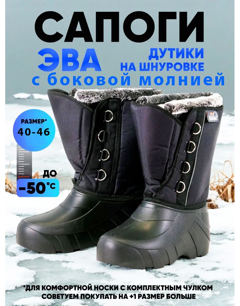 Мужские зимние сапоги Следопыт исполнены в виде дутиков на шнуровке. Надежно защищают ноги от холода за счет применения ЭВА материала с 4-слойным вкладышем. Температурный режим ношения до -50 градусов. Материал сапог водонепроницаем. Удобная колодка обеспечивает комфортную носку обуви. Верх изготовлен из водоотталкивающей ткани Оксфорд, фиксируется на ноге с помощью шнуровки. С внутренней стороны голенища для удобства одевания установлена молния. Низ изготовлен из материала ЭВА, обладающего нескользящим эффектом.