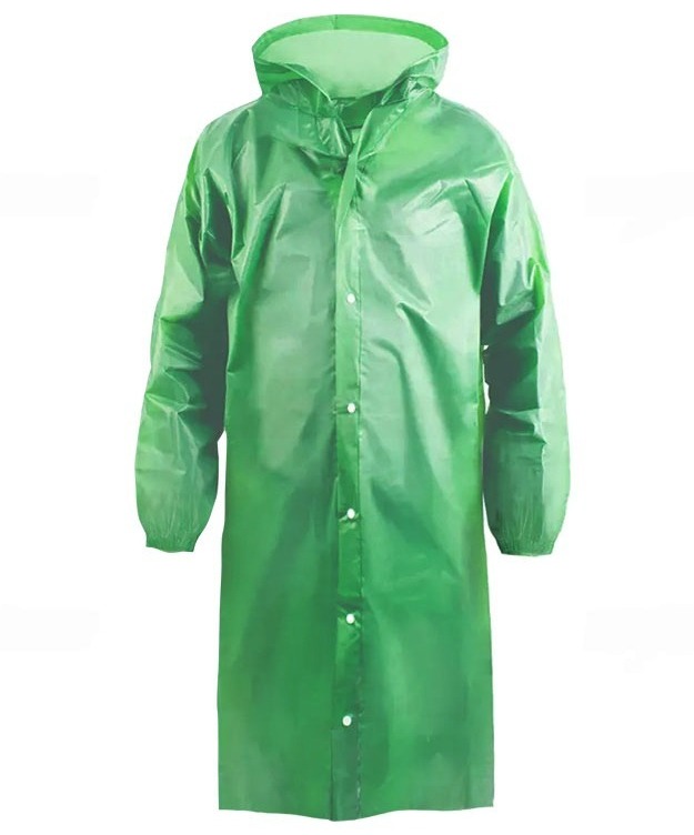 Дождевик зеленого цвета из полиэтилена на кнопках. Дополнительной защитой служат завязки на капюшоне..