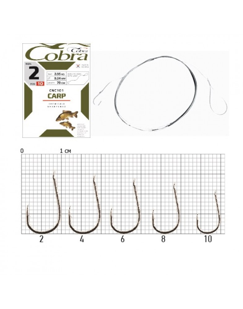 Для поклонников карпфишинга бренд Cobra выпустил линейку специальных крючков CARP для ловли трофейной рыбы. В зависимости от используемых приманок, рыболов может выбрать различные модели крючков этой серии для насаживания приманки на жало или для изготовления волосяной оснастки. Крючки серии CARP выпускаются в широком ассортименте размеров, что находит применение в фидерной ловли с различными монтажами. В качестве материала использована высококачественная стальная проволока. Тефлоновое покрытие надежно защищает изделие от коррозии.