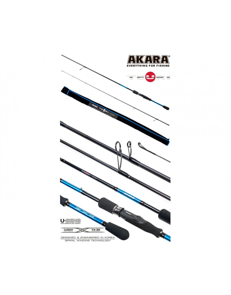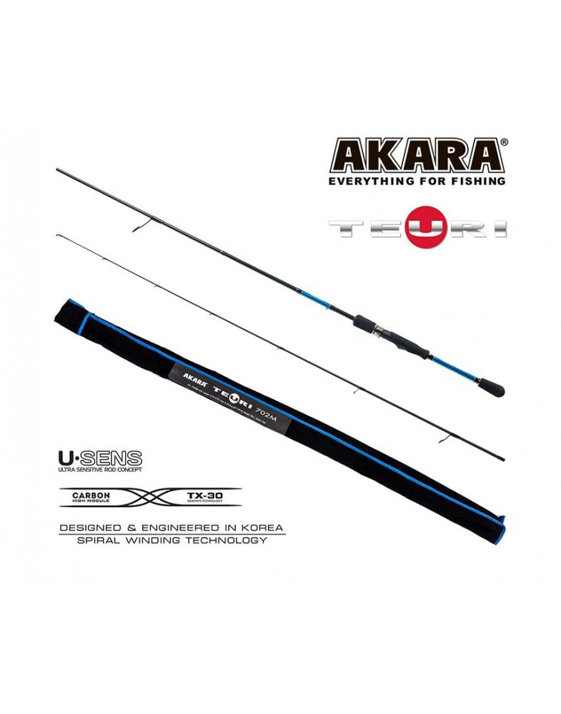 Обновление в модельном ряду угольных спиннингов от Akara - серия Teuri. В линейке представлены, как спиннинги для ультра-лайта, так и удилища для тяжелого джига (heavy jig). Благодаря использованию графита концерна Toray TX-30 (40-ton) и инновационным технологиям плетения бланка спиннинг обладает повышенной чувствительностью при проводке, что делает его незаменимым при контактных видах ловли: джиг, твич, ловля на техасскую оснастку и с отводным поводком. При производстве бланка спиннинга использована технология UPIT. Расстановка колец произведена по технологии New Guide System, позволяющая оптимально расположить кольца на бланке, определить их количество и размер (вес). Облегчённые кольца Kujira XR Long Super Hard ZrO2 (1600-1800H, kg/mm2).