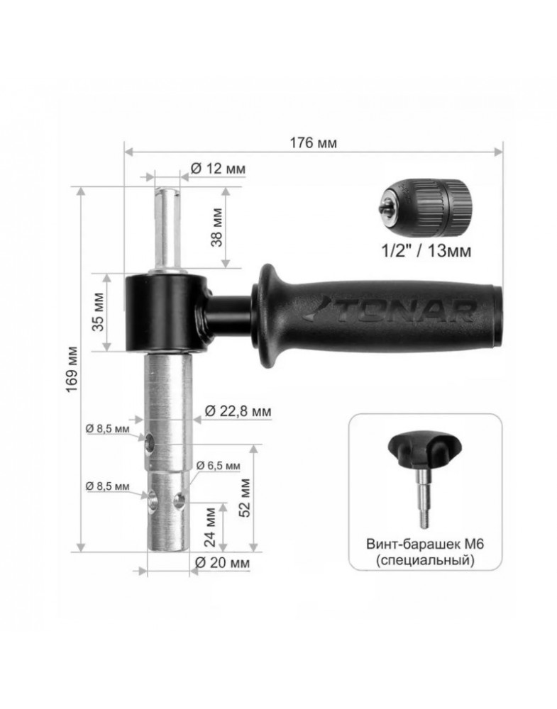 Адаптер для ледобура под шуруповерт "Тонар" T-ASH-2023-PK-01 (с 2 подшипниками качения и винтом-барашком М6 специальный в комплекте) предназначен для применения аккумуляторного шуруповерта при бурении шнеком лунок во льду при ловле рыбы. Благодаря двум подшипникам качения, увеличивается ресурс работы адаптера и уменьшается процесс прикипания металла. С помощью шуроповерта, данного адаптера и шнека можно легко сверлить лунки, затрачивая на это минимум усилий и времени. Габаритные размеры: 176x169x50 мм. Диаметры выходного вала адаптера: 20 / 22,8 мм. Диаметр хвостовика адаптера: 12,0 мм. Посадочный диаметр патрона шуруповерта: 1/2 дюйма (максимальный диаметр зажима - 13 мм). Диаметр отверстия для фиксации винтом-барашком: 6,5 / 8,5 мм. Подшипник качения: 2 шт. Вес изделия: 0,65 (± 0,1) кг. Материал хвостовика и корпуса адаптера: сталь. Ручка: пластик с прорезиненным покрытием.